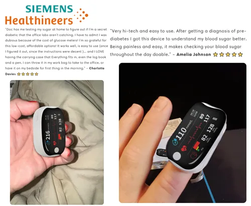 Silicone ring protection and fast measurement: Siemens devices feature a silicone ring protection that improves finger fit and reduces interference from ambient light. This design ensures more sensitive measurements, with results displayed in just 8 seconds.